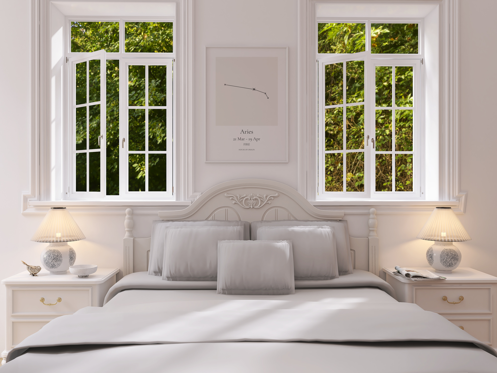 Featuring the Aries star formation in a clean, structured composition, this artwork captures the fire sign’s strength and forward momentum. The balanced layout and neutral palette allow the constellation to command attention with quiet authority, making it a striking addition to thoughtfully curated interiors.